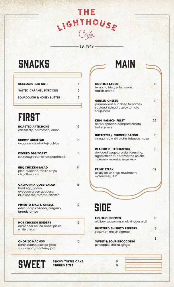Introducing the menu at The Lighthouse Cafe, located in Hermosa Beach, CA, offers a diverse selection of dishes ranging from Roasted Artichoke Caesar dip to Buttermilk Chicken Sando. The menu features options for vegetarians and meat lovers alike, with items like Codfish Tacos, Prime Steak, and Classic Cheeseburger. The relaxed atmosphere with live music and Happy Hour specials creates a vibrant dining experience perfect for groups or a night out. Customers rave about the California Cobb Salad and the quality of the ingredients used in all dishes. With ample parking options and attentive service, The Lighthouse Cafe is a must-visit spot for music enthusiasts and food lovers alike. Don't miss the chance to indulge in delicious food while enjoying live music at this iconic venue.